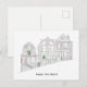 Cartão de férias desenhado à mão ilustrando as casas vitorianas decoradas que alinham as ruas de São Francisco.