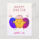 Cartão-postal de feriado de Pintinho de Páscoa e Felz pascoa de ovos. Pintinho bonito com casca de ovo rachada na cabeça e um ovo azul e um ovo de Páscoa roxo. Adicione o nosso nome e envie SMS para dentro da placa ou apague-a.