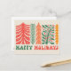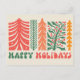 Esta vibrante carta de férias engloba um design retrô que apresenta uma série de árvores estilizadas em tons de vermelho, laranja e verde, cada uma com seu próprio padrão decorativo único. As árvores são enfeitadas com estrelas, bagas e ramos festivos, evocando um sentimento de alegria e chorona de férias. As palavras "Feriados Felizes" são exibidas em negrito, com letra divertida na parte inferior, acrescentando um toque nostálgico a este design delicioso. Perfeito por enviar saudações alegres durante a época festiva com um talento vintage.