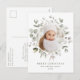 Cartaz de feriado elegante com sua foto rodeada por groselhas de neve com aquarela, folhas de eucalipto e folhagem verde-salva-vidas. Personalize a frente do cartão postal de Natal botânico com uma saudação personalizada, seu nome familiar e o ano em caracteres verdes seniores. O cartão postal reverte para exibir seu endereço de devolução e mensagem personalizada.