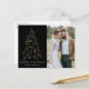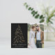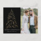 Cartão postal de férias moderno e elegante com a sua fotografia complementado por um pinheiro de folha de ouro falso de neve com fundo preto (ou cor da sua escolha). "Feliz Natal" é apresentado numa fonte serif branca e moderna com o seu nome ou texto personalizado abaixo. O cartão postal de feriado fotográfico reverte para exibir seu endereço de devolução e mensagem personalizada.
