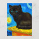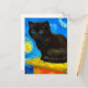 Cartão postal com um gato Van Gogh no estilo da Noite Estrelada! Um gatinho negro e fofo permeia uma mesa contra um céu azul e uma lua amarela. Um presente perfeito para amantes de gatos e colecionadores de arte holandeses!