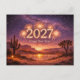 This breathtaking design captures a magical New Year moment beneath a vast desert night sky. Brilliant golden fireworks illuminate the number 2027 against a backdrop of sparkling stars and a glowing Milky Way. Below, a serene desert landscape features silhouetted cacti, rugged mountains, and a reflective lake bathed in warm sunset tones of amber and violet. Soft lantern light and distant adobe-style buildings add a peaceful, southwestern ambiance. The rich blend of deep purples, fiery golds, and twilight blues creates a dramatic yet tranquil atmosphere perfect for welcoming the new year with wonder and natural beauty.
