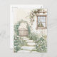 Primavera, cartão postal de verão com um charmoso jardim de cabanas com uma estética de aquarela macia. Uma via de pedra enrolada conduz através de verde-luxuoso e flores silvestres delicadas em pastéis cor-de-rosa, brancos e macios. Um portão de madeira arquitetado, enfeitado com as vinhas escaladas, acrescenta um toque caprichoso à cena. A parede russa da cabana é parcialmente visível, mostrando uma janela enquadrada em madeira com cortinas correntes. Acima da janela, uma rellis suporta flores rosa cascata, melhorando a atmosfera romântica e serena. A ilustração evoca um sentido de tranquilidade, nostalgia e encanto do campo.