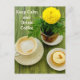 This cozy postcard features a warm cup of coffee paired with a sweet dessert and a bright yellow flower, set against a natural green background. The simple and uplifting message “Keep calm and drink coffee” adds a relaxing and cheerful touch, perfect for everyday moments.