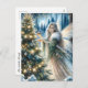 Cartão postal personalizado de Natal. Ilustração de uma fada ou anjo decorando uma árvore de Natal em uma floresta encantada.