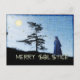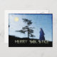 Female figure in hooded cloak on a hill with full moon, gold stars, and a solitary winter evergreen. The words wish you a "Merry Solstice."
