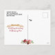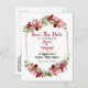 Um cartão postal de lançamento elegante, mas rústico, "Salvar a data". A ilustração tem rosas vermelhas cor-de-rosa e arrojadas com verde em uma armação. O lado inverso tem gráficos de casamento correspondentes. A caligrafia pode ser personalizada com sua escolha de palavras, fonte e formatação.