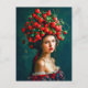 Fechamento artístico de uma mulher adornada com uma coroa de morango, inspirado pelo retrato clássico de arte. Cores ricas e estilo de fotografia de cor.