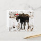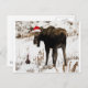 Mose de Natal e pato, ambos com chapéus de Papai Noel em pé na neve.