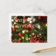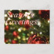Um cartão-postal de Natal festivo, com a tradicional saudação de Natal de 'Saudações de Seasons', contra uma árvore de Natal decorada.