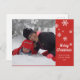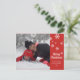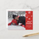 Cartão postal festivo de Natal com um modelo de foto. O fundo é vermelho, flocos de neve brancos sobrepõem a foto. Insira sua foto favorita no modelo. Você pode personalizar o texto Feliz Natal, saudação pessoal com nomes e número do ano. O texto está em uma fonte escrita à mão branca trendy. O verso do cartão postal tem flocos de neve brancos em um fundo vermelho.