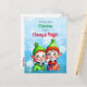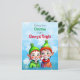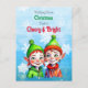 Um bonito cartão postal de Natal com uma menina e um bebezinho bonitinho em verde e vermelho com flocos de neve.