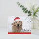Este cartão-postal mostra uma fotografia de um lindo cão que recupera ouros que está vestindo um chapéu vermelho de Papai Noel e está cercado de neve. O texto na frente lê, "Acredite", enquanto o texto personalizável nas costas diz, "Felizes Feriados."
