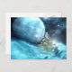 Christmas on a different planet. Outer space or alien. Snow covered Christmas tree on a snowy environment with a large planet or moon looming overhead and a smaller ringed planet in the background. Could be the uninhabited areas of earth or a totally alien setting. Scifi fans unusual Christmas holiday postcard