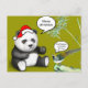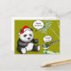 Panda de Natal falando com um faisão parado em uma rocha. com um fundo de grama verde. com Feliz Natal em texto preto. e saudação da estação dos faisões