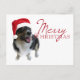 Um belo cartão-postal de férias para amantes de cães, com um adorável pembroke welsh corgi vestindo um chapéu vermelho de santa. Feliz Natal está escrito em vermelho ao lado da fotografia bonitinha.