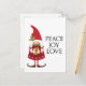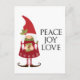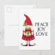 Design caprichoso de Natal apresenta adorável gnomo menina com texto "Paz, Alegria, Amor". Personalize a parte de trás com sua mensagem especial para as festas de fim de ano.