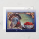 Imagem vintage de um peru em pé ao lado de uma tigela de maçãs vermelhas e as palavras 'Saudações de Ação de Graças'. A paleta de cores apresenta tons terrosos quentes. Este design é baseado em uma imagem de domínio público da coleção Nancy Oram.