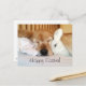 This postcard features a photograph of a cute sleeping golden retriever dog who is snuggling in bed with a white stuffed rabbit. Text on front reads, "Happy Easter!" while text on back reads, "Somebunny loves you." Both can be changed or deleted to suit your needs.