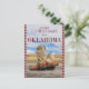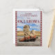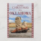 Este cartão-postal de férias apresenta uma espetacular fotografia ocidental com botas vestidas de cowboy a esportistas de um par de esporções de peso mexicano feitas por medida, completadas com letras "Yeeha" e correias de couro. O texto vermelho no topo diz "Feliz Natal de "Oklahoma", com a OKLAHOMA sendo feita de um padrão de xadrez de búfalos vermelho e preto. As botas estão sobre madeira em frente a uma nuvem azul cheia de céu ocidental. Uma borda vermelha e branca com flocos de neve faz o cartão festivo.