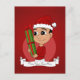 Cartão-postal de férias com ilustração de um bonito sorridente rapaz hispânico/latino ou bebê asiático, ele está vestindo um chapéu de Papai Noel vermelho e branco e segurando um presente de Natal; com um modelo de texto editável para seu nome ou mensagem, um design de Natal com fundo vermelho