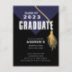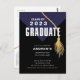 Convite de festa de formatura da turma de 2022 moderno e ousado com uma capa de graduação azul com uma borla dourada sobre um fundo preto. Visite nossa loja para ver este design em uma variedade de cores escolares.