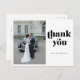 Cartão postal de agradecimento de casamento com design retrô simples e elegante. Apresenta as palavras 'obrigado' em uma fonte linda à direita do cartão. Versão clássica em preto e branco, altere a cor do texto ou deixe como está. Personalize com a foto do seu casamento e adicione sua mensagem no verso para criar um cartão de agradecimento que seus convidados irão guardar com carinho. Por favor, explore o conjunto de cartões de agradecimento de casamento para uma seleção de outros designs.