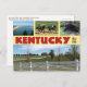 Celebrando o estado de Kentucky nos EUA com fotos multivisuais do lago Cumberland, corridas de cavalos, entrada da Caverna Mammoth, e uma fazenda com cerca branca de madeira. O nome Kentucky está no meio com os EUA e um pequeno ícone de bandeira americana.