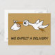 Cartão postal de gravidez fixe. Um cartão postal de cartão engraçado com cegonha com bebé e um texto pessoal: Estamos à espera de uma entrega! A maneira perfeita e original de dizer aos seus amigos que está à espera de um bebé!
