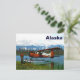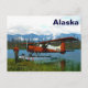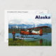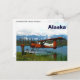 Um piloto de arbusto fica perto do seu flutuador de Havilland Canada DHC-2 Beaver na costa de um lago no extremo norte; montanhas e árvores estão à distância. A leitura de texto "Alaska" também é exibida. Esta imagem foi derivada, em parte, de uma foto do Serviço de Pesca e Vida Selvagem dos EUA.