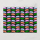 Este cartão postal apresenta uma série de diferentes porcos de desenho animado coloridos. Cada um tem a cabeça para baixo, pronto para engolir qualquer comida que encontrar. Os porcos estão em linhas alternadas de rosa e azul e verde e laranja.
