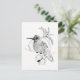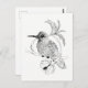 Cartão postal preto e branco com ilustração gráfica colibri e flor.