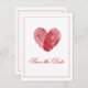 Este é um anúncio clássico de salvar a data com um toque de fantasia adicionado. Duas impressões digitais se interligam para formar um coração ecoando a ideia de como dois se tornam um. Suas informações personalizadas são impressas no verso dentro de uma moldura correspondente. Disponível com produtos correspondentes.