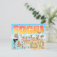Cena brilhante e colorida oferece uma vista espetacular do Sul da Califórnia - personagens estranhos brincam na praia e no deserto de SoCal, mostrando Los Angeles, San Diego, Riverside, Palm Springs, Anaheim, parques de Anza Borrego e Joshua Tree, bem como as cidades fronteiriças de Tijuana, Tecate e Mexicali. Essa cena encantadora tem tudo - um surfista se equilibra enquanto uma sereia se deita em uma rocha, uma orca salta para fora da água, animais do zoológico cumprimentam os turistas, um casal musculoso de praia se flexiona para impressionar enquanto um T-Rex rosna um desafio e um tanque se move para a posição e muito mais…