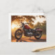 Este cartão postal apresenta uma motocicleta no campo no final da tarde.