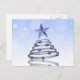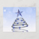 Abstrato e a ilustração 3D moderna, com uma árvore de Natal cromo prateado com ornamentos azuis e uma estrela superior sobre um fundo azul-claro de um boque.