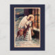 Este cartão-postal de natais vintages mostra um anjo do céu com um veado carregando presentes de Natal olhando pela janela na véspera de Natal para trazer paz e boa vontade.