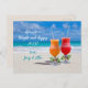 Praia tropical, aplausos aos cartões postais do novo ano. Duas bebidas em uma praia tropical são decoradas com estrelas-do-mar e sagrado. Personalize a saudação e adicione uma assinatura. Um modelo de endereço é fornecido na parte traseira das placas ou esse texto pode ser removido.