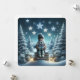 Cartão postal de natal de fantasia tradicional, uma menina segurando um presente sentada em livros na floresta de abetos no natal em terra de inverno noite mágica estrelas