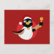 Cartão-postal com uma ilustração de um pinguim real bonito segurando um cetro e vestindo um chapéu vermelho de Papai Noel; design de desenho de Natal para crianças, em um fundo vermelho