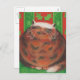 Um gato feliz de tortoisinferno (parecido com um pudim de natal!) senta-se em uma almofada verde contra um fundo vermelho e verde com padrão de folha oca. Cartão postal com um design personalizável para personalizar com seu próprio texto, imagens e ideias. Um desenho de lápis colorido original de Jess Perry.