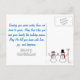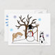 Este cartão-postal tem Huskies Siberianos brincando na neve com um boneco de neve e caindo flocos de neve.