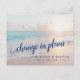 Cartão postal de notificação de adiamento de casamento de destino de praia para informar aos seus convidados que o local do casamento ou a data (ou ambos) deve ser reagendada ou alterada por qualquer motivo. O texto é vago o suficiente para que você não precise compartilhar o motivo, ou editar o texto para dar uma explicação de cheio, se desejar. O lindo pôr do sol da praia apresenta ondas oceânicas bonito e fontes modernas de escrita de caligrafia e uma combinação de diferentes tipografia. Visite o Compro de Destinos de Fita de Papel do Zazzle Designer para ver mais convites para casamento sobre tema de viagem e praia, salvar as datas e adiar anúncios.