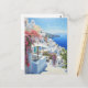 Um cartão elegante com as palavras “Obrigado!” e uma vista pitoresca de Santorini. Casas brancas como a neve com cúpulas azuis, o mar e flores de bougainvillea brilhantes criam uma atmosfera de romance e conforto mediterrâneo. Perfeito como cartão de agradecimento após um casamento, feriado ou viagem, bem como um souvenir requintado.