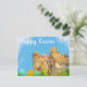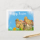Pintinhos de Páscoa com fundo azul-céu, grama e ovos de Páscoa bonitinhos.