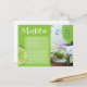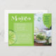 Receba o cartão postal do Mojito, uma bebida tradicional cubana de cocktail de alta-bola feita com rum, hortelã e limão. O cartão inclui uma fotografia de uma garrafa que entra num copo com a menta e o limão, gráficos de fatia de limão e folha de menta e a receita.