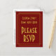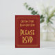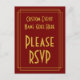 Este design genérico de cartão postal de resposta com estilo inspirado nos anos 1920 apresenta a mensagem "Por favor, responda" na frente, juntamente com o nome personalizado do evento. Também apresenta um formulário de resposta personalizado no verso, juntamente com um endereço personalizado para onde os cartões de resposta seriam enviados. Cartões de resposta como este podem ser usados para descobrir quem irá a um chá de noiva, uma festa de Natal, um jantar, ou algum outro evento.