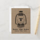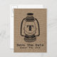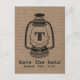Um cartão de salva data de casamento com uma ilustração totalmente preta de uma lanterna de óleo estilo camping sobre um fundo inspirado em saco de aniagem. Personalize com seu monograma. Personalize o texto na frente e no verso.