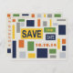 Design gráfico colorido de cartão postal de salvar a data abstrato Pop Art por Artinspired. O design moderno apresenta quadrados e retângulos. A paleta de cores inclui azul-marinho, laranja, verde, amarelo e tons de cinza. Este cartão postal de salvar a data funciona bem para casamentos, aniversários, festa surpresa, formatura, festa de debutante, bar mitzvah, bat mitzvah, reuniões, eventos de arrecadação de fundos, festas de feriado, festas de Ano Novo, chás de bebê e muito mais.